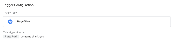 - Find an existing trigger or create a new one that will fire only on the confirmation page (in the example below, we have a page path containing thank-you, but it might be a different one in your case, as long as it is a confirmation page-only) and apply it to the tag.