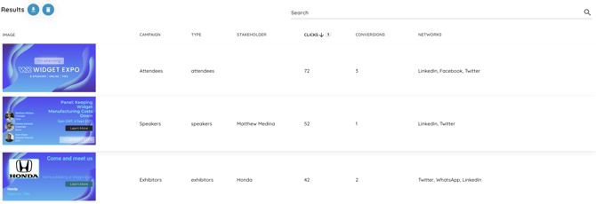 - Results section that allows you to download and export the overall results, search for a specific campaign and see all the image templates that have been shared with more details on the clicks and where the images have been shared